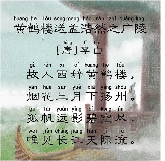 《黄鹤楼送孟浩然之广陵》是李白创作的一首五言绝句,诗中以送别朋友的情节,抒发了对友情的深深珍视和人生的深沉思考。通过描绘离别的场景和长江的流淌,诗人展现了人生的无常和离别的辛酸。这首诗的语言深沉,情感真挚,给人以深深的共鸣。希望你们在学习和欣赏这首诗的过程中,也能感受到李白的诗才和他的深情厚谊。
